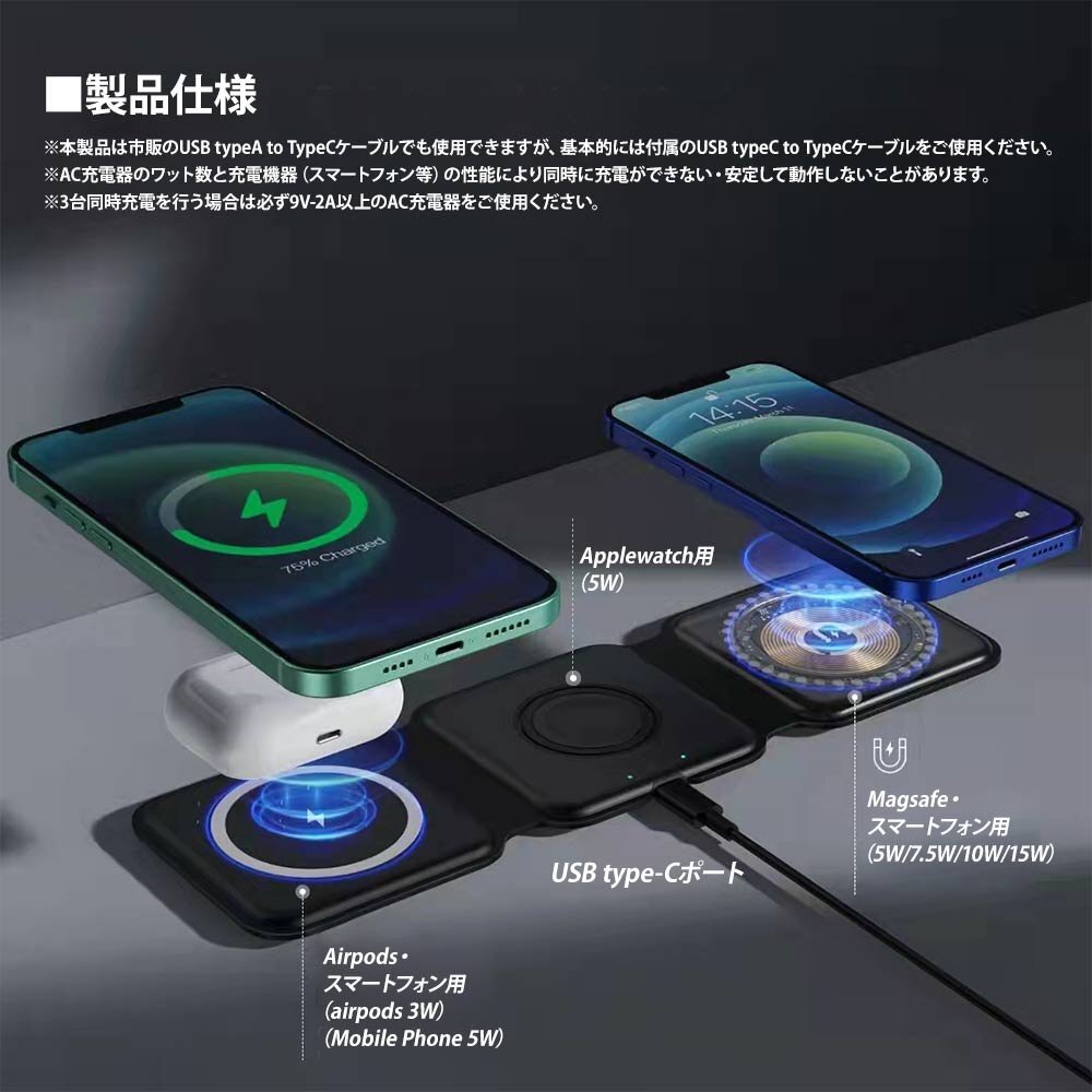 3in1 ワイヤレス充電器 急速充電 15W applewatch充電器 iphone12/13/14 applewatch2/3/4/5/6/7/8/9/SE Airpods1/2/pro3 Android ホワイト 收藏
