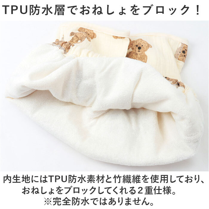 | 商品説明 | ・・ふんわりガーゼで優しくブロック☆ベビー おねしょパンツが登場。 ・【コットン100%のふんわりガーゼ】 ・表地はコットン100%のガーゼ生地を使用し、洗うたびにふんわりする、お子様に優しい作り。 ・【TPU防水層でおねしょをブロック!】 ・内生地にはTPU防水素材と竹繊維を使用しており、おねしょをブロックしてくれる2重仕様。 ・※完全防水ではありません。量が多い場合はもれてしまう可能性があります。 ・ おねしょ対策アイテムなので、立っている状態ではなく寝る際に履かせてください。 ・【成長に合わせてウエスト調節可能◎】 ・アジャスター付ウエスト!お子様の成長に合わせて調節ができ、長く使える。ズレの心配も不要◎ ・【男の子も女の子も使えるキュートさ】 ・シンプルなこっくりカラーの無地タイプから、キュートなイラストデザインまでご用意☆ ・【出産祝い1歳のお誕生日のギフトに】 ・実用的で可愛いアイテムなので、ギフトにもオススメ。トイトレを始めるお子様にも♪ |
