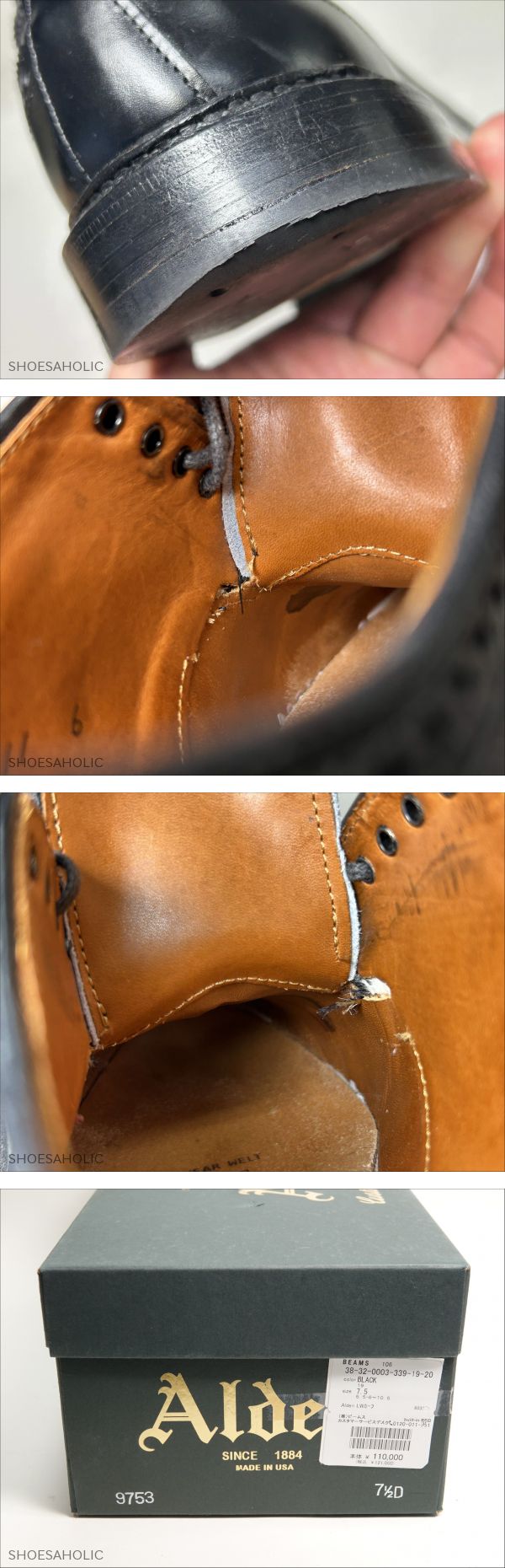 604 / 0925 使用数回 オールデン ロングウィングチップ ブラック カーフ 7.5D #9753 收藏