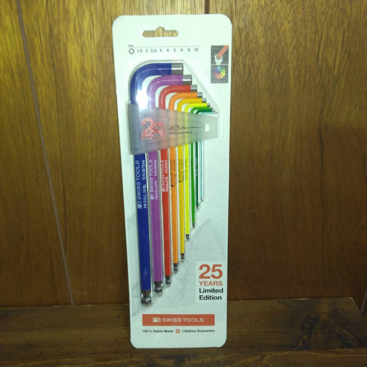 タイトル「PB SWISS TOOLS(ピービースイスツールズ)レインボーレンチ発売25周年限定セット(全400セット限定品) ボール付ロングレインボレンチセット」。発注数量(メーカー全体で):400 セット限定品 レインボーレンチが発売されて25年になるということで、ホルダーに25周年、CEOのマルコ・バウマン氏のサイン入りです。 通常品(212.LH-10RBCN パックあり)の希望小売価格16,500円(税抜)とは別に設定し、販売しやすい価格にしてあります。