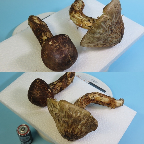 松茸の大きさ 開きの重さは約74.5g長さ15㎝ 傘径10㎝あります。蕾は長さ11.5㎝ 傘径5.5㎝重さ約45.5gあります。