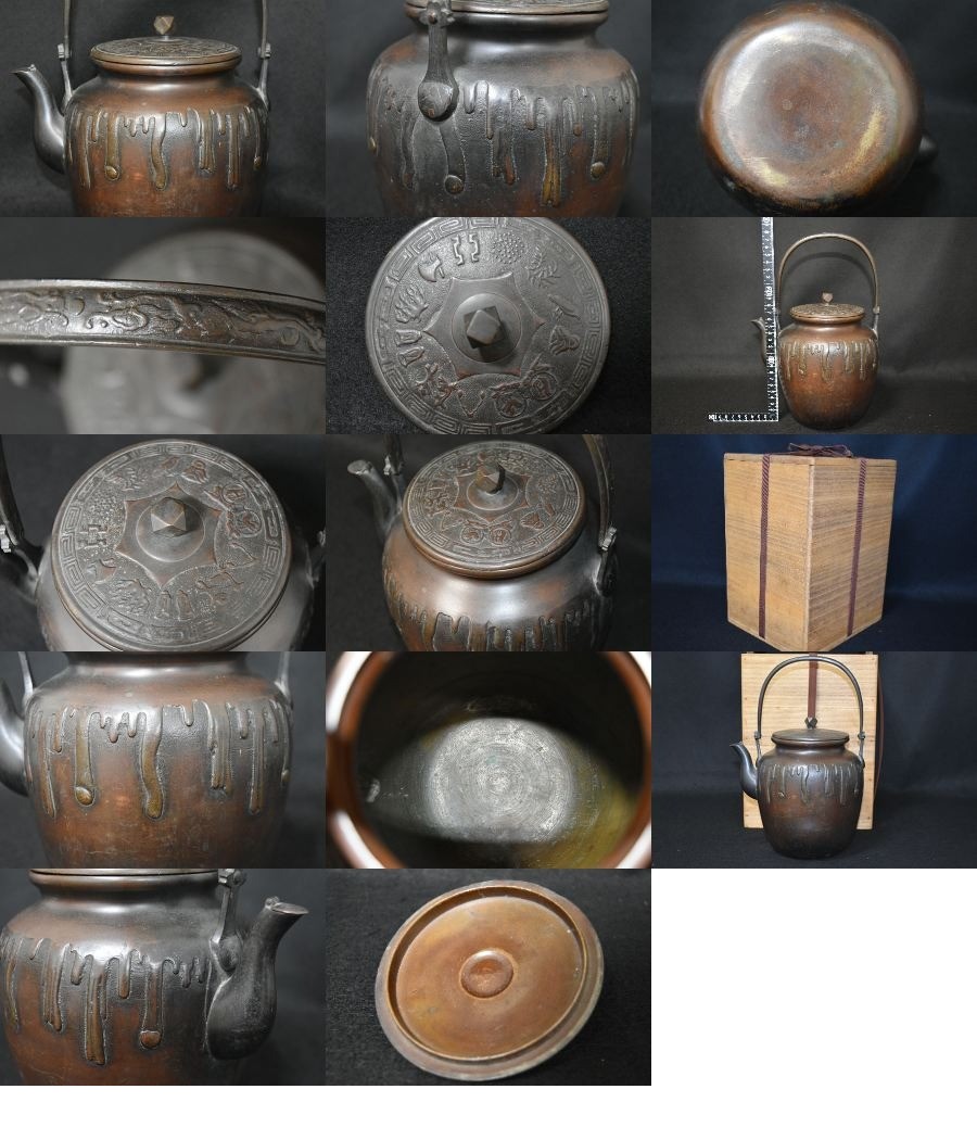 【光成】煎茶道・紫銅「龍文堤手・変り蓋・垂れ釉壷型・時代銅瓶」水漏無・1396g