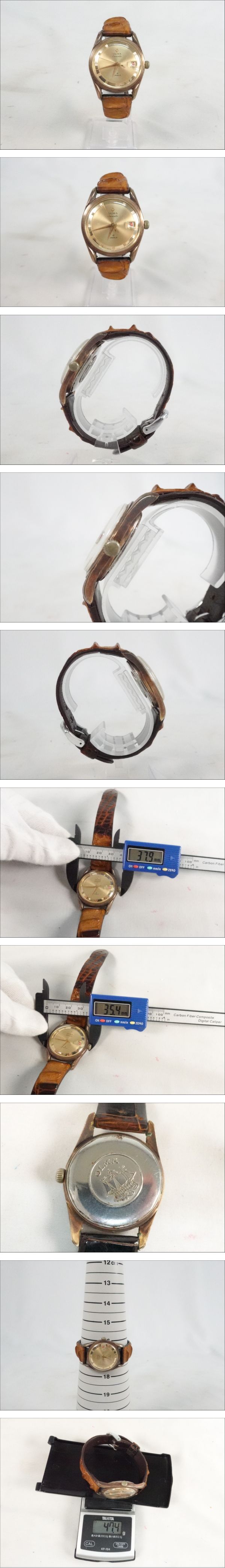 ブランド名:OLMA 商品名:腕時計 型番:不明 シリアル:不明 ベルト:純正 腕周り:画像にてご確認下さい。 総重量:画像にてご確認下さい。 サイズ:画像にてご確認下さい。 ムーブメント:手巻き 付属品:無し 動作:稼働している確認ができました。 リューズを回して時間調整確認できました。 リューズを24時間回して日付の変更は確認できました。 その他の操作は未確認となります。 長時間の動作確認は行っていないため、日差含め正常な動作かは分かりかねます。 ※あくまでも検品時の動作となりますので予めご了承下さい。 状態:譲り受けた商品の為、購入時期や使用頻度など詳細は分かりかねます。 中古品の為、フェイスや外観に傷やスレが見受けられます。 素人の為、ご質問いただいても回答できない場合がございますが、 画像を追加致しますので、欲しい写真があった場合ご質問頂ければと思います。 神経質な方のご入札はお控え下さい。目視でのご確認となります。 商品の状態に関しては画像にてご判断下さい。 ※オーバーホール歴は不明でございます。 ※裏蓋を外した画像がない商品は、裏蓋を外して内部の確認は出来ておりません。 ID:0005132025-10301 弊社はインボイス登録事業者です。 登録番号:T8370001039877 ※※入札前に必ずお読みください※※ 説明文をよくお読みの上ご入札下さい。 画像に写っているものが全てになります。 商品の重さを量っているものに関しては多少の誤差がありますので、ご理解下さい。 商品の状態に関してはご自身でご判断の上、ご入札下さい。 あくまでも主観に基づく感想です。状態判断は画像にてお願い致します。 商品に対しどちらの情報が欲しいか分かりかねる部分もございますので、落札前にご質問頂ければと思います。 中古品の為、神経質な方のご入札はお控え下さい。 ご入札後の入札取り消しは出来かねます。 専門知識がなく、ご質問いただいても回答できない場合がありますが 気になる点がある方は入札前にご質問下さい。 素人による検品の為、見落としている場合もございます。 ご了承下さい。 ノークレーム・ノーリターンでお願いします。 | |||