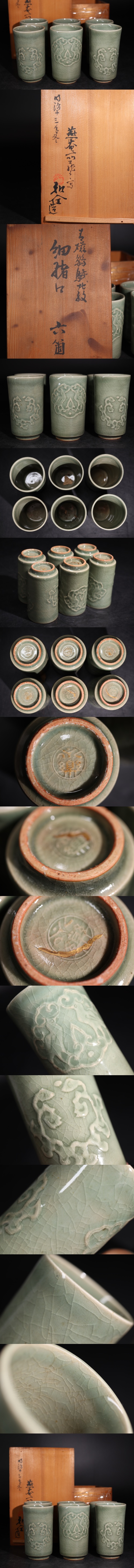 | 永楽和全 造 青磁 鳥文 陽刻 細猪口 六客 金継ぎ 共箱付 / 永楽 京焼 酒器 酒杯 茶器 煎茶道具 .G3150 |