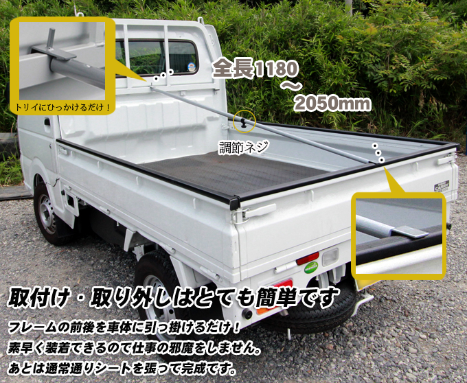 | 【フレーム】 全長:1180~2050mm 質量:1.5kg 材質:スチール(ネジ部は樹脂) 適合車種:軽トラック |