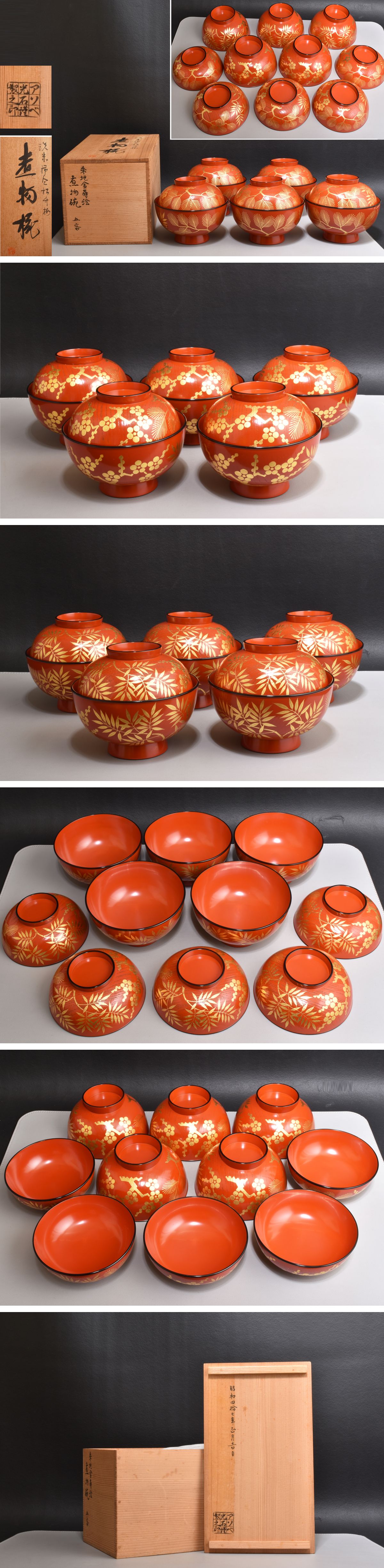 6210 煮物椀 朱地金蒔絵松竹梅 5客 アソベ光石 天然木 美品 共箱 收藏