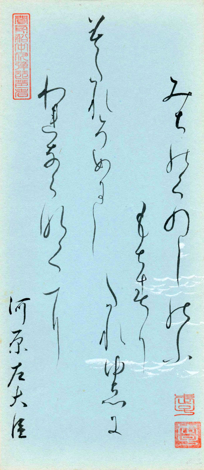 自筆切の稀少価値は、和紙の生成技法の緻密さにあります。日本の和紙の場合、極めて薄い和紙の上に墨の文字がくっきりと浮き上がることが断層画像写真によって鮮明となります。肉眼では見ることのできない和紙の繊維の一本一本のミクロの世界を見ることができます。自筆原本は茶会用の掛軸から外され海外展示のために再表装をしております。掛軸や屏風にすることが可能なように、「Removable Paste(再剥離用糊)」を使用しているため、自筆の書に影響をあたえずに、容易に「剥離」することができるような特殊な表装となっております。 |