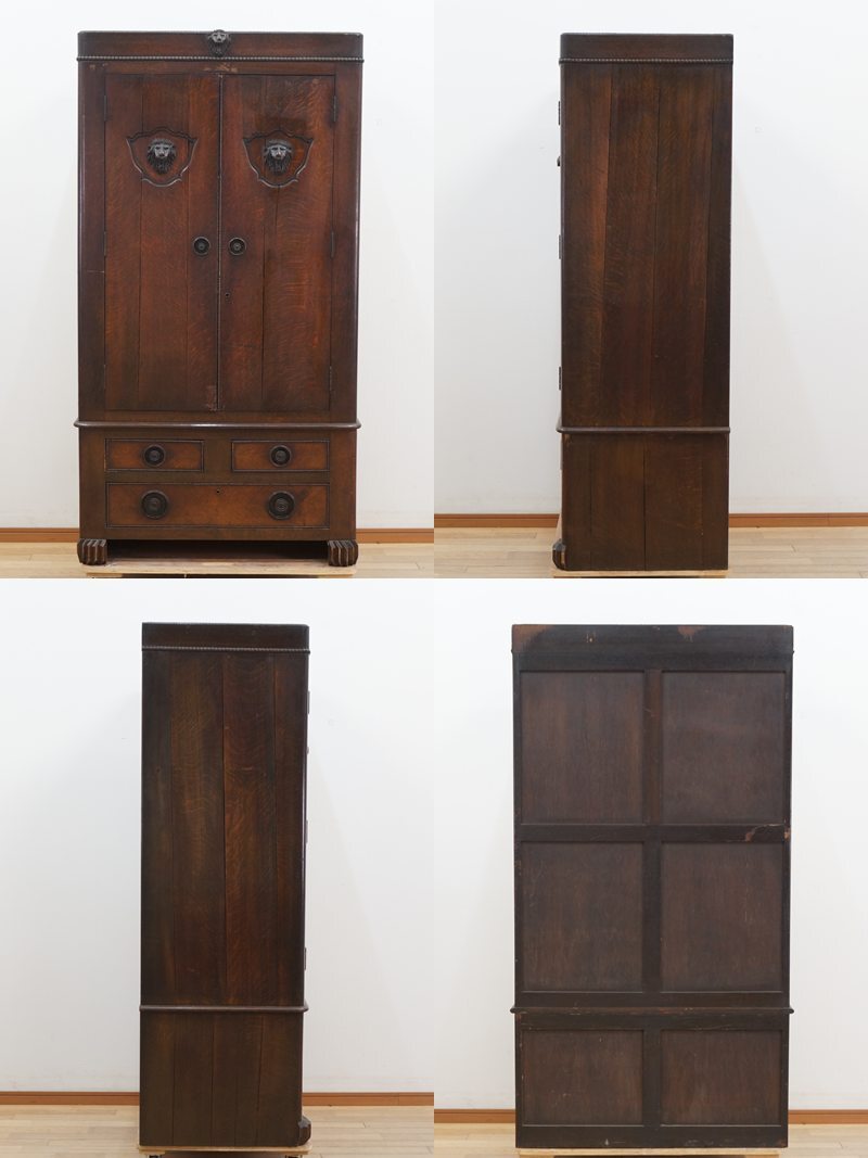 ■東ハ:【クラシックインテリア】ライオンヘッド 木彫り装飾 天然木 ワードローブ 幅約94㎝ 高さ約172.4㎝ 両開き扉 内部ミラー付 洋服タンス■ クラシカルな佇まいが魅力の「 ワードローブ 」になります。 使い込まれた時代の味を感じる、大変雰囲気のあるお品です。 やや小振りなワードローブながらも存在感・重厚感があるため、 ショップなどのディスプレイを兼ねたインテリアとしていかがでしょうか。 【サイズ】 (約)高さ172.4 × 幅94.0 × 奥行56.0 cm 中古のお品となります。 付属品は写真にあるものが全てです。 ※鍵の付属はございません。 使用に伴うシミ・着色ヨゴレ、キズ・ケズレ・欠けなどが複数、 ハガレ跡残り、ヒビ入り・割れが複数ございます。 内部ポール・フックにくすみ・サビ、ミラーにシミ・下部中央あたりに円形状に色ヤケ・サビ跡、 鍵の不足がございます。 扉の開閉時に扉下部と本体に擦れがあり、扉の合わせに位置ズレ・手前に浮きがございます。 側面下部の割れの合わせに浮きによる段差・スキ間がございます。 商品画像をよくご確認の上、ご参加ください。 [管理No.25080683XI] |