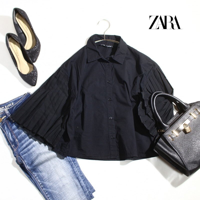 美品 ZARA ザラ プリーツスリーブ 七分袖 シャツ XS ブラック 黒 ゆったり ブラウス 收藏