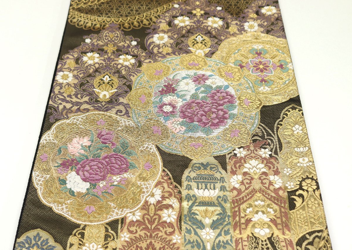 しなやかな帯地は、重厚感のあるゴールドのお色目で、光沢感がございます。白色、深紫色、錆青磁色、小豆色、金銀糸などのお色目で、洋風の装飾模様や鏡裏文などの高貴な模様が表現されております。金彩が施されており、華やかな印象でございます。所々には帝王紫のお色目が添えられており、柄行にアクセントを添えております。インパクトのあるお洒落な逸品でございますので、お薦めでございます。