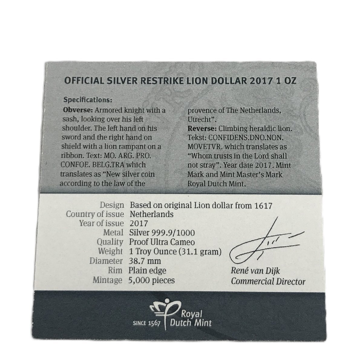 ★2017年オランダ ライオンダラー ロイヤルダッチミント 銀貨 1ST DAY OF ISSUE NGC社PF70UCM 最高鑑定!白ラベル B1490 收藏
