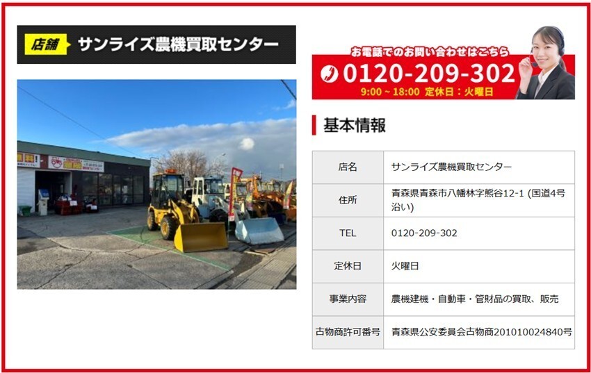 | サンライズ農機買取センター 【住所】青森県青森市八幡林熊谷12-1 【TEL】 017-752-8977 【対応時間】 9:00~18:00 【定休日】 毎週火曜日 URL:https://sunrisetrading.tokyo/ ※定休日・営業時間外のご連絡・ご質問対応は翌営業日以降の対応となります。 | |