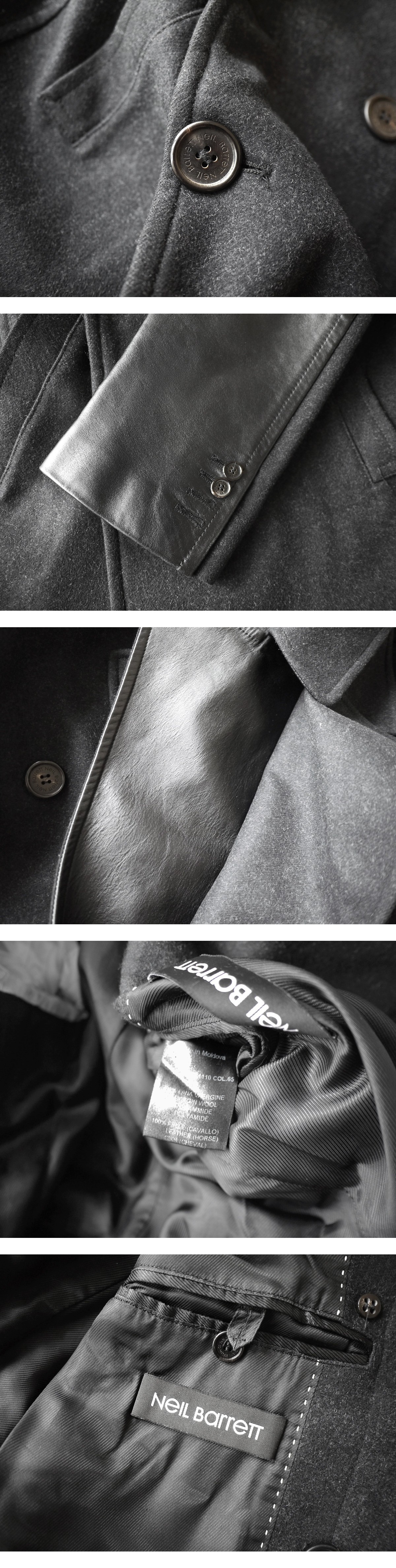ニールバレットのホースレザー×ウールメルトンダブルブレステッドコートでございます。コレクションランウェイ登場のバリエーションモデルで、ニールバレットならではのモードテイストあふれるエッジのきいたデザインとカッティングが印象的な逸品です。