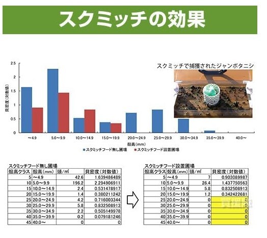 大栄工業 ジャンボタニシ 捕獲器新しい防除!/お米の収量向上、経費削減に貢献する/ジャンボタニシ(スクミリンゴガイ)トラップ スクミッチ//●誘引効果大/ジャンボタニシの減少が見られ、特に被害が大きい成長したジャンボタニシに対して大きな効果が見られる/●環境配慮/従来の防除剤よりも安価に済む可能性が高く、農薬を使用していないため、環境にもやさしい/●貝が嫌がる銅テープが侵入口に貼られているので、逃亡を防ぎます!/●フード(誘引剤)は、オリジナルブレンドでジャンボタニシを集める効果を発揮します。//【特徴】/(1)持ち運びがしやすい、軽量設計/(2)トラップ使用後も、スリットから排水/(3)誘引剤は水に溶け、環境にやさしい/(4)透明なので中身の確認が簡単/(5)トラップからの逃亡率が減少(※)/※トラップ改良により誘引後の逃亡率が約50%から20%まで減少//【使い方】//(1)1反にスクミッチを3つ程度を設置。おススメは、水の出入りがある場所とジャンボタニシが繁殖しやすい中心!/(2)田植え後、水が入った後に設置。スクミッチフードは1週間程度で交換メーカー:大栄工業(A-DEFENCE/エーディフェンス)//品名:ジャンボタニシ 捕獲器 スクミッチ3台 + フード1袋 セット//【本体仕様】:/[品名]ジャンボタニシ捕獲器 スクミッチ/[品番]SRK600-A1(またはSRK600-B1)/[サイズ]幅500×奥行き250×高さ100mm (※取っ手部分は除く)/[効果範囲]半径約15m (※実験農場での検証による)/[素材]ポリカーボネート、(蝶板)ステンレスまたはABS(※)/※当商品にはスクミッチ専用フード(SRK-F1)は付属しておりませんので別途ご用意下さい。/※蝶板の素材はステンレスまたはABSのどちらかとなります。お選びいただくことは出来ませんので予めご了承下さい。//【フード(誘引剤)仕様】:/[品名]捕獲器スクミッチ用 フードのみ 1袋(12個入) 誘引剤/[品番]SRK-F1/[入数・内容量]1袋 (約30g×12個入り)/※スクミッチフードの推奨保存期間 約6ヵ月/