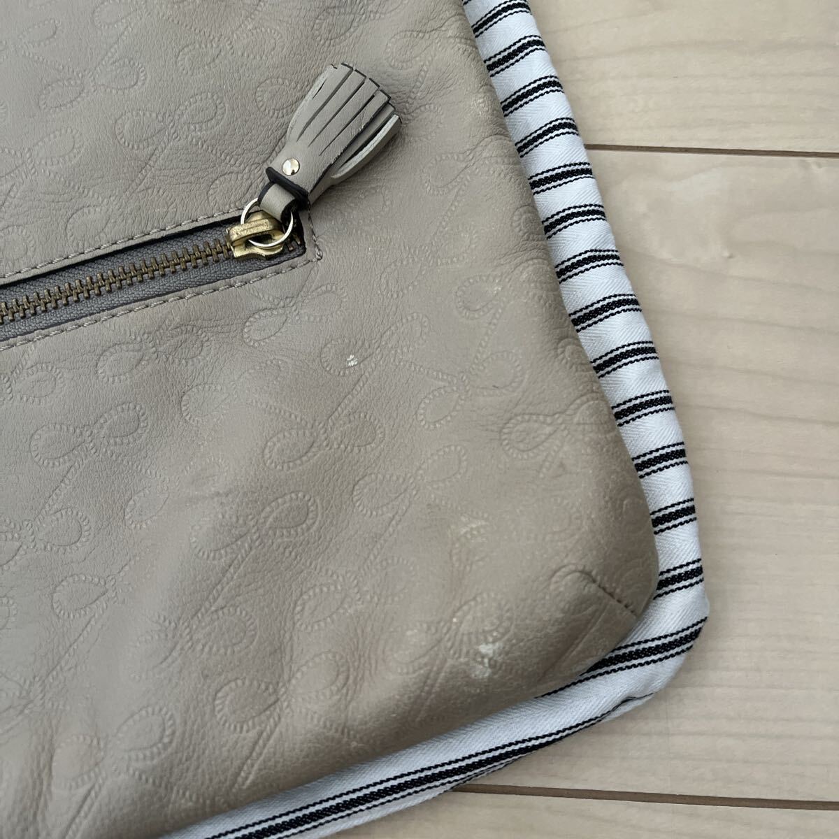 ご覧いただきありがとうございます。アニヤハインドマーチのストライプ柄のタッセルショルダーバッグです。一時よく使用しておりましたので、角スレや汚れがあります。目立つ大きな汚れはありませんが、中古品にご理解のある方に。ショルダーは斜めがけできます。長さ調節ができますので、ハンドバッグや外せばクラッチバッグのようにも使えます。外にファスナー付きポケット、内側にオープンポケット1つ、ファスナー付きポケット1つ、ペン刺しがついています。保存袋とカードが付きます。