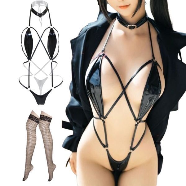 【送料無料】ボンテージ セクシー コスプレ 小悪魔 女性用 エナメル 光沢 マイクロビキニ 水着 黒 コスチューム 衣装 網タイツ ハロウィン 收藏
