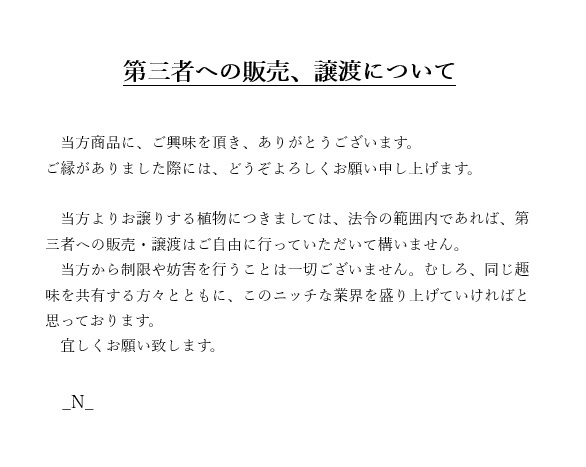 | ①海外発送は致しておりません。 ②無責任な発送は致しません。 天候に不安がある場合、当方の判断で発送を遅らせる場合がございます。ご了承下さいませ。 ただし、天候は予測できないところがございますため、確実な輸送をお約束するものではございません。詳しくは、【輸送天候について】をご確認下さいませ。 もし、ご出張やご旅行などで、ご不在の日が続き、直ぐに商品を受け取れない場合は、ご入金時に取引メッセージより「〇月〇日以降の発送希望」とお伝え下さい。ただし、2週間以内でお願い致します。また、輸送日数など当方側では保証致し兼ねるため、こうしたご希望は、お受け取りのご希望ではなく、発送日のご希望でお願い致します。 ③品質については写真/映像のみのご判断でお願い致します。 ④丁寧な梱包を心がけさせて頂きますが、当方専門業者ではございませんので、死着・枯れ着への保障はございません。ただし、落札者様に全て押し付けるというのはあまり誠意がございませんので、救済措置の可能性は残しております。詳しくは、【商品受取/開封時の注意事項】をご確認下さいませ。 ⑤ご入札後のキャンセルや落札後のキャンセルは、他のご希望者様・入札者様に対して、大変迷惑な行為となります。責任を持ったご入札をお願い致します。また、評価があまり芳しくない方のご入札は、当方の判断で取り消しさせて頂く場合がございます。 ⑥お支払いは落札の翌日15時間までにご完了頂けますよう宜しくお願い致します。もし、何らかのご事情により、それが難しい場合は、落札後12時間以内にお支払予定日をご連絡下さい。ただし、先過ぎる日程のお支払予定日設定については、お受けできない場合がございます。これら適切に行われなかった場合は、お支払いの意思なしとし、落札者都合による削除とさせて頂き、次番のご希望者様を繰り上げさせて頂きます。 ⑦発送後のキャンセルはお受け、出来兼ねますので、ご留意下さいませ。また、発送日調整のお申し出以降のキャンセルもお受け出来兼ねますので、ご留意下さいませ。 ⑧当方は常々誠実な対応を心がけております。マナーは守って頂けますよう宜しくお願い致します。 ⑨他の入札者様/ご希望者様への妨害や安全を脅かす行為、モンスタークレーマー、誹謗中傷、身勝手な理由で悪評価をされる行為、虚偽の流布、など倫理的に問題のあると考えられる行為に対しましては、厳しい対応を取らせて頂きます。 ⑩当方側に重大な過失が認められる場合、商品代金を持ち逃げするような真似は決して致しません。【商品受取/開封時の注意事項】に沿って、返品/返金の対応を進めさせて頂きます。 ⑪本商品説明に記載されていない事項につきましては、保証されていないものとお考え下さい。もし、どうしても確認が必要な事項がございましたら、質問欄から質問頂き、疑問点を全て払拭された上で、ご入札下さいませ。 ⑫ノーリターン&ノークレームを原則とさせて頂きます。 | |||