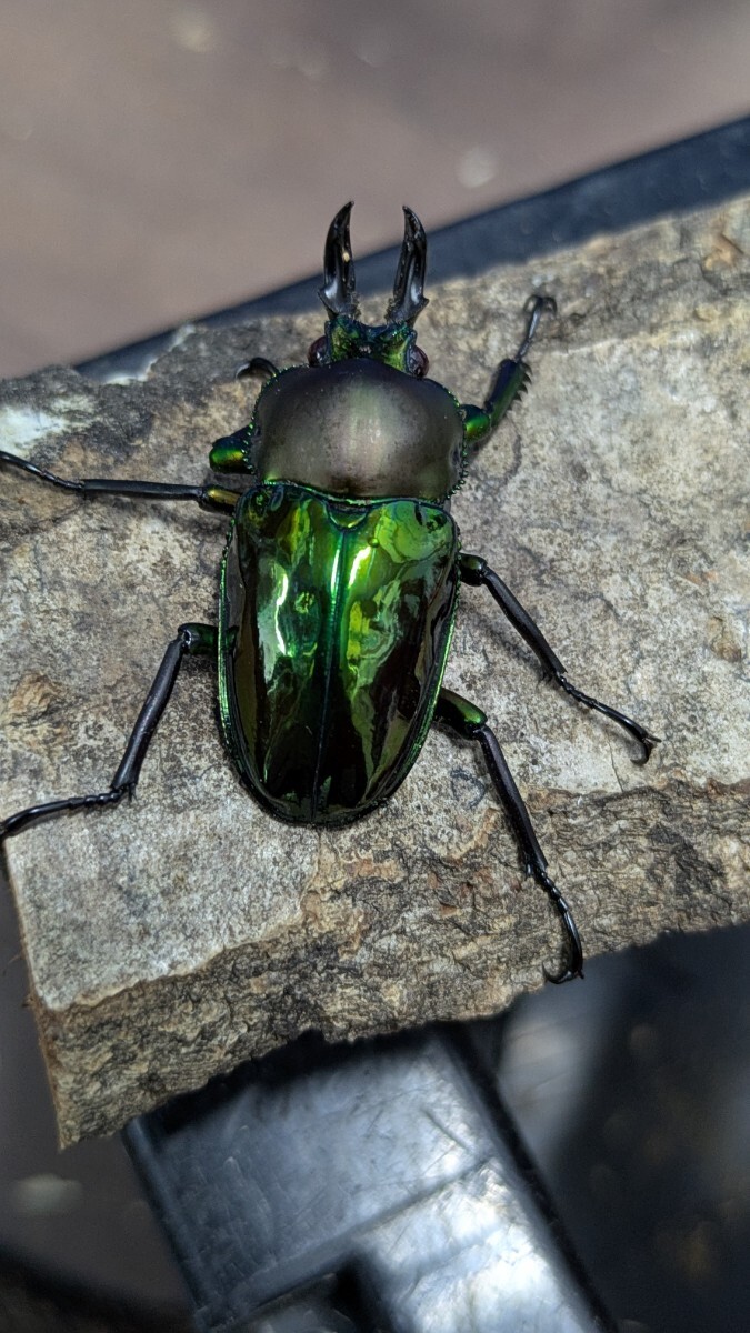 ●赤眼とグリーンカラーを追求して累代を続けてます。マットブラックな前胸に濃いスーパーグリーンはとても魅力的なカラーです。青紋とホワイトアイの血が入ってますので、両方の遺伝子は少なからず有ります。