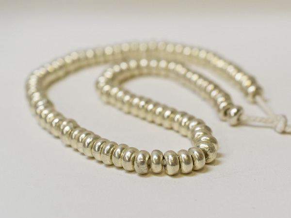 タイ北部やビルマの山村に暮らす山岳少数民族カレン族が作るシルバービーズ一連です。シルバー925製の扁平丸型ビーズです。ホワイトハーツビーズ等との相性が良いビーズです。大きさや重量には若干の個体差があります。バラでご購入いただくより約10%お得です。