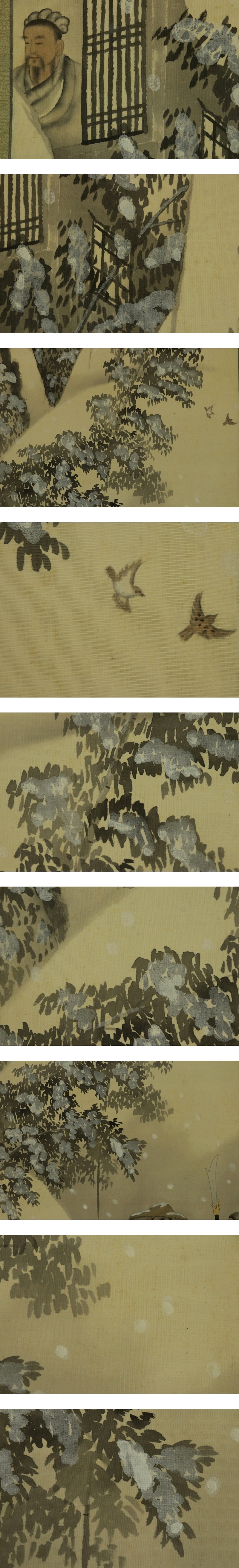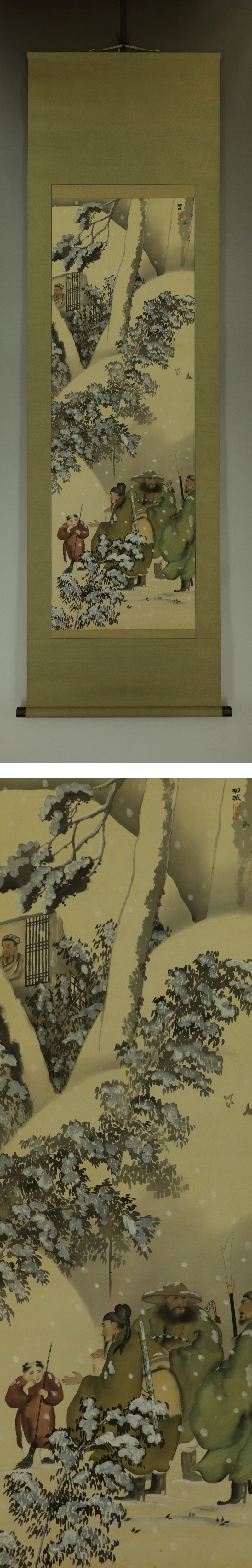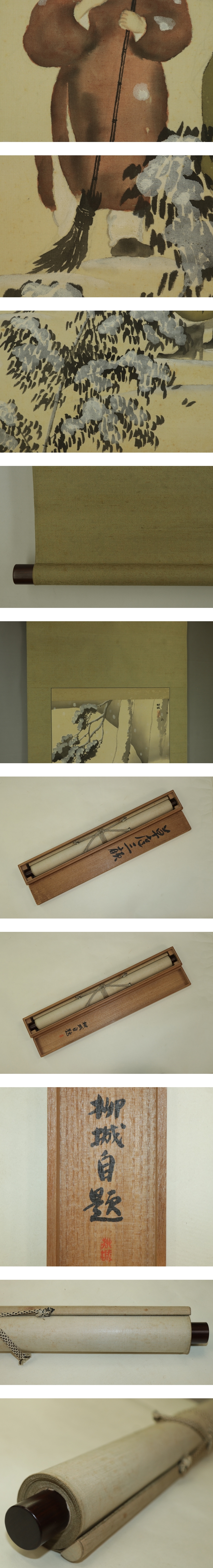 石川柳城 いしかわ-りゅうじょう(1847-1927) 明治-大正時代の日本画家。 弘化4年10月生まれ。 生地の名古屋で中野水竹,吉田稼雲につき,京都で文人画を学ぶ。 詩や書もよくした。名古屋で後進の指導に尽くした。 昭和2年11月17日死去。81歳。本姓は伊東。名は戈足。 本紙は、染み、汚れ、剥落、ヤケがあります。 表装は、染み、汚れ、破れがあります。 【サイズ】 作品 横約42cm×縦約126.5cm 表装 横約56cm×縦約194cm |