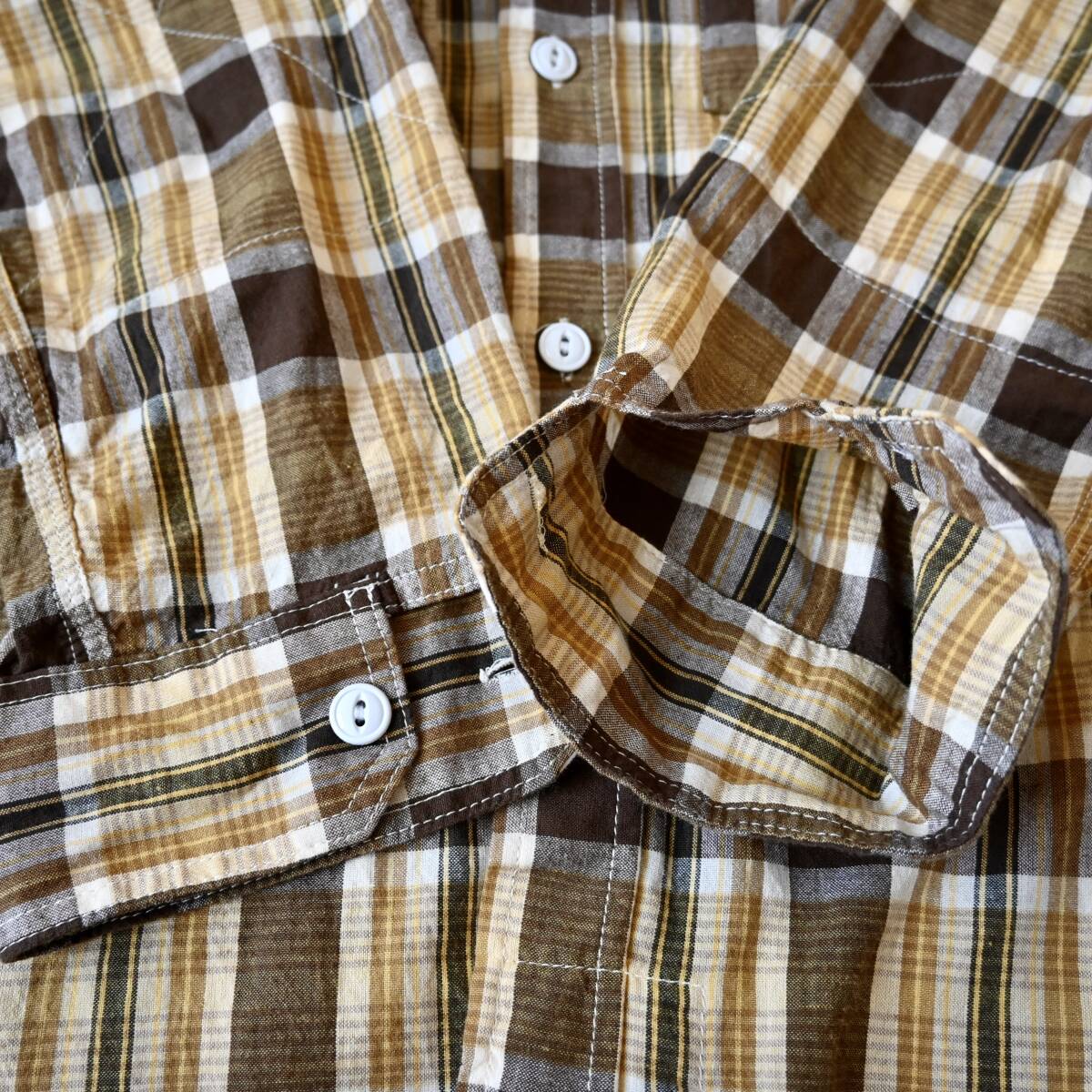 良品【2000s オールドENGINEERED GARMENTS マスタード×ブラウンプレッド ライトウェイトコットン ワークシャツ 表記XS USA製】ビンテージ 收藏