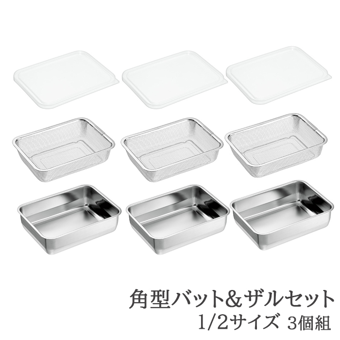丈夫で耐久性に優れた18-8ステンレス製のざる・バット・蓋×各3個セット。