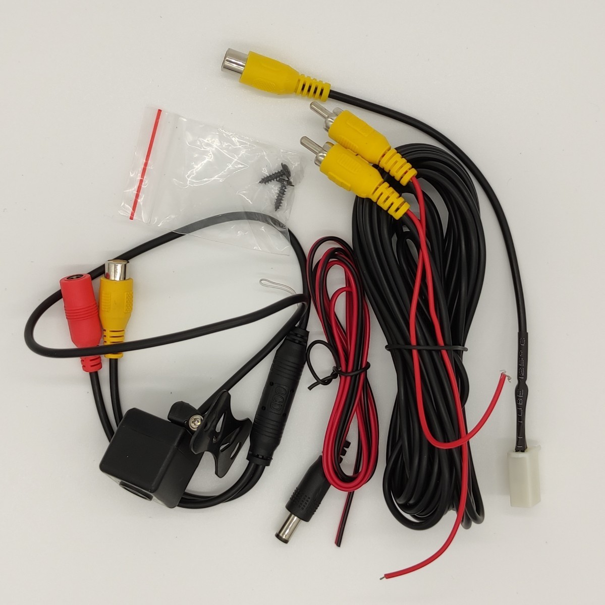バックカメラ・電源ケーブル・映像ケーブル・映像出力変換ケーブル・ネジ*2・英語配線図