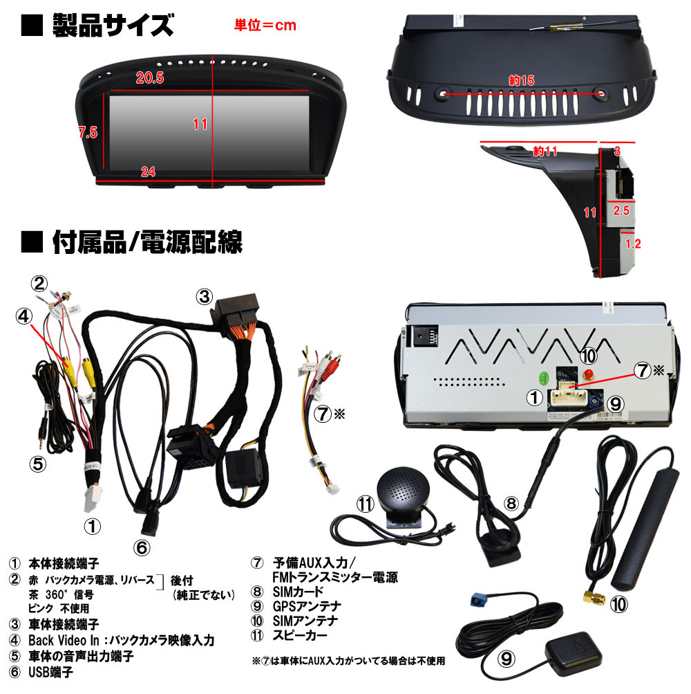 | 付属品 | BMW専用電源配線,GPSアンテナ,SIM用アンテナ, 外部音声入力配線,ミニ予備スピーカー |