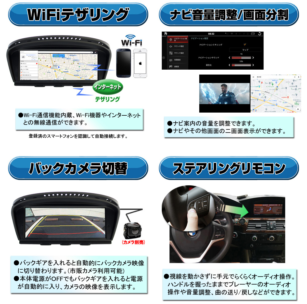 お車元々の機能と互換性があります。 ステアリンクボタン、iDriveコントローラ、パーキングセンサー、バックカメラなど変更なく、使用できます。