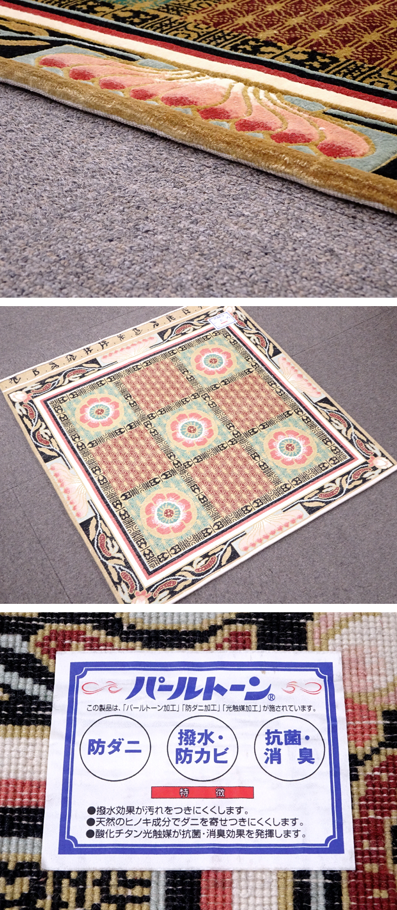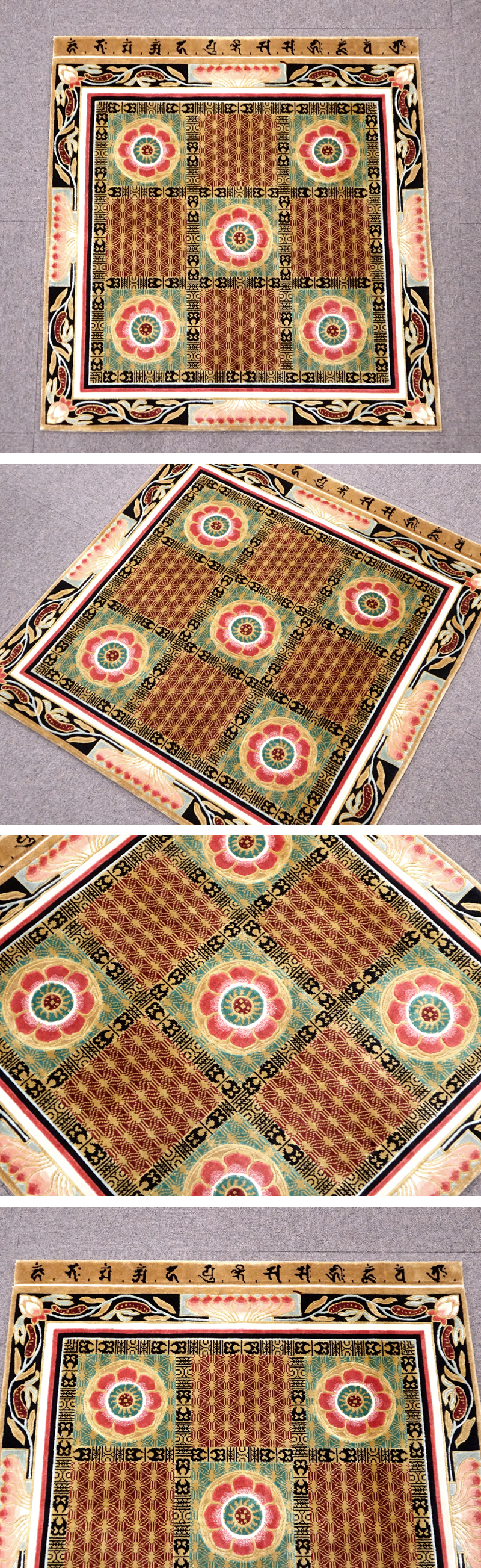 慶應◆日本製 絹100% 総シルク 唐花文緞通 梵字入 91×95㎝③ 收藏