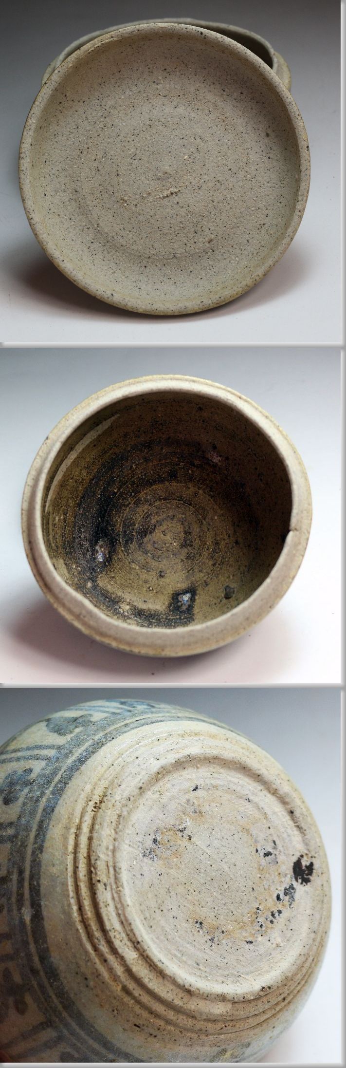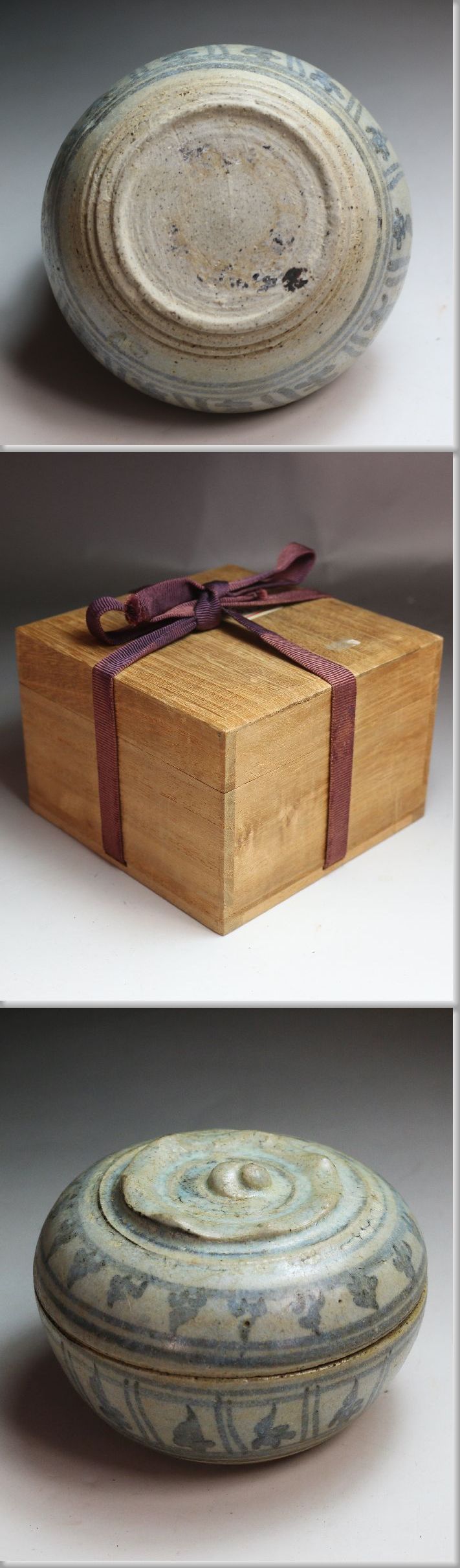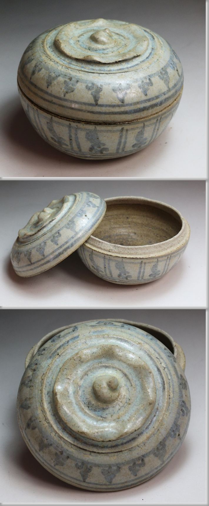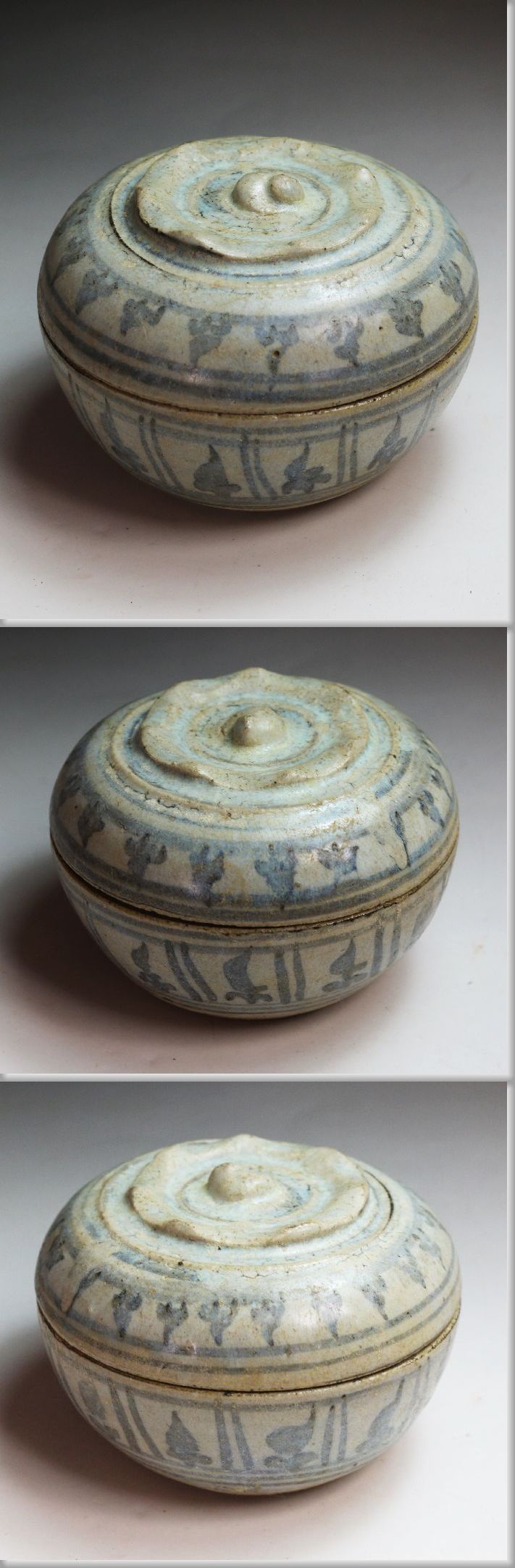 15・16世 宋胡録(すんころく) 青釉ラマ式蓮弁文合子 桐箱を
